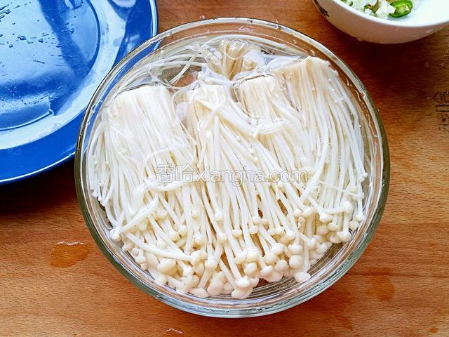 2.锅中加水烧开,放入金针菇,关火,烫2分钟捞出