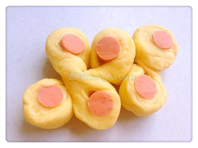 1.面粉中加入2个鸡蛋,盐、白糖用温水化开酵母和均匀揉成面团