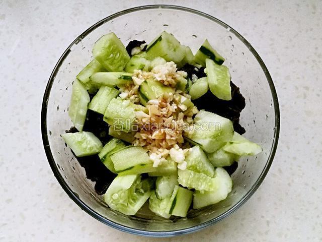 6.木耳沥干水分放入碗中,黄瓜,蒜沫放入碗中,倒入生抽,醋,香油,盐,糖,辣椒油