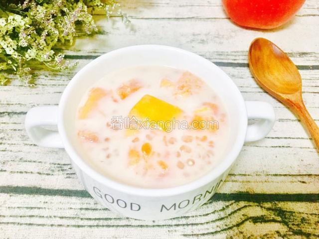 6.将木瓜、杏仁露和糖放锅里约煮二分钟。