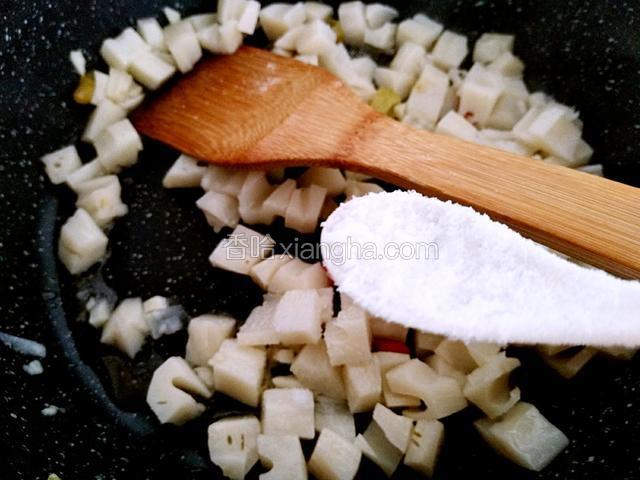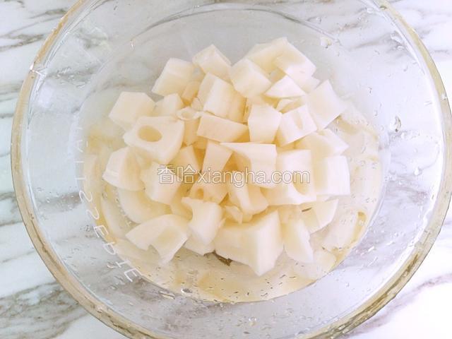 4.小锅中烧开水后放入藕丁焯水煮一分钟左右捞起待用