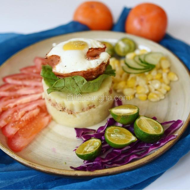 4.用圆形模具,铺上一层土豆泥再挤上沙拉酱和肉松,再盖上一层土豆泥^_^压实