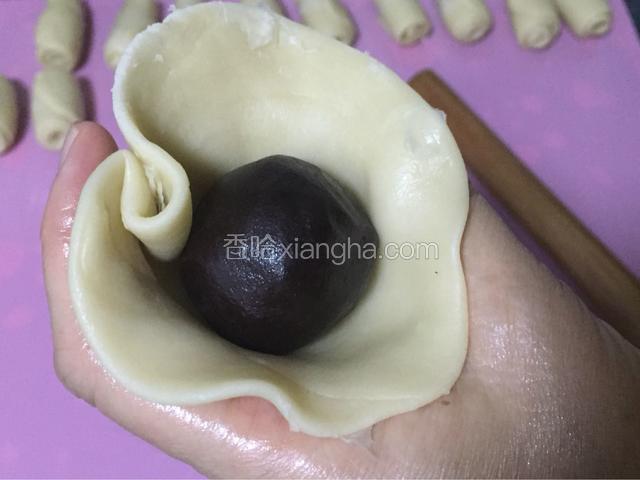 30.将之前包好的豆沙蛋黄馅儿放中间,然后收口