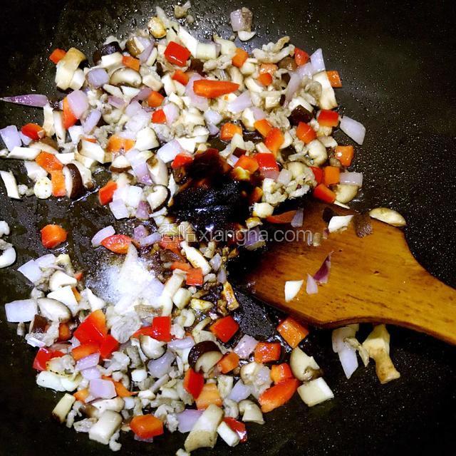 6.肉切末,香菇切小粒,红辣椒切小粒,蒜切小块,洋葱切小粒