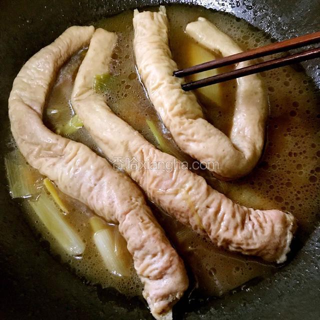 2.猪大肠清洗干净,关于猪大肠的清洗我有发菜谱大家可以看一下,我是直接洗好放冰箱冷冻拿出来的。将猪大肠放入锅中,加入盐、料酒、蚝油、酱油,姜片和大葱段,八角