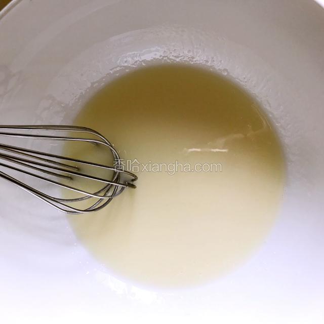 3.用手动打蛋器顺着一个方向不停搅拌至牛奶和玉米油混合状