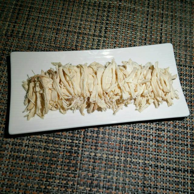 4.煮好的鸡胸肉手撕成丝装盘