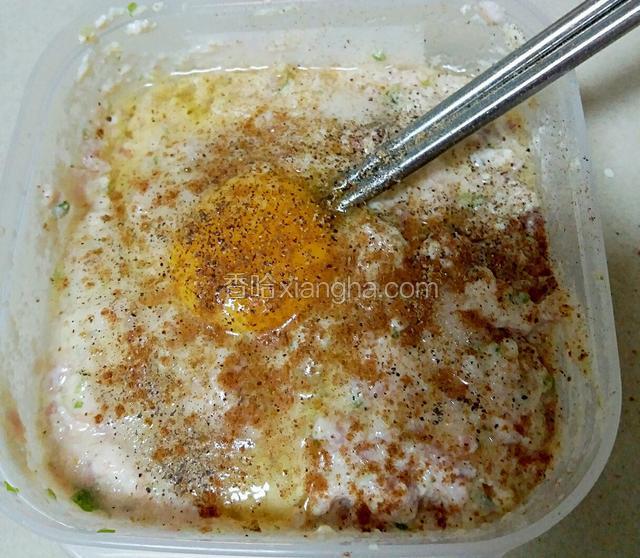 3.接着放入一个鸡蛋,黑胡椒粉,料酒,太太乐鲜鸡汁和一勺盐,搅拌入味。