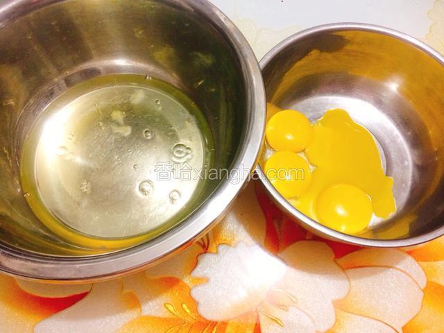 3.分离蛋清和蛋黄,装蛋清的盆必须无水无油,且不能混入蛋黄。