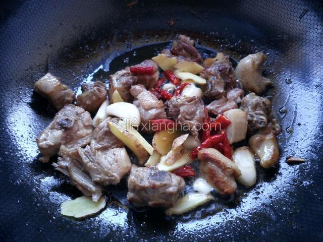 5.将鸭块下锅炒至上色,加入葱姜蒜继续炒