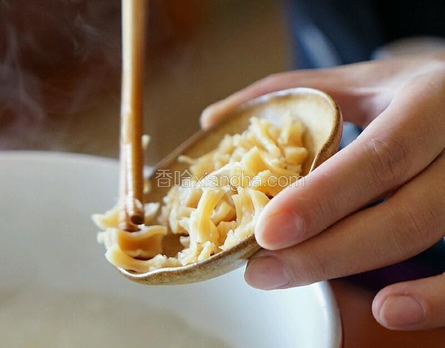 6.期间米熬至开花,加入干贝,根据自己喜好决定放入虾油,4-5勺;再加入姜丝。
