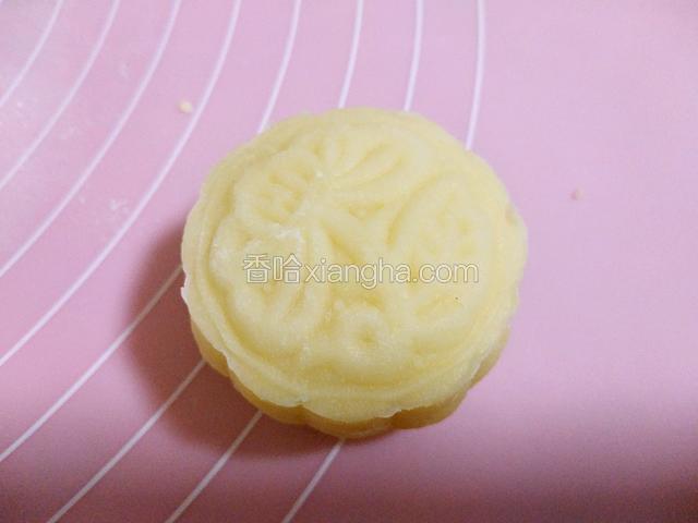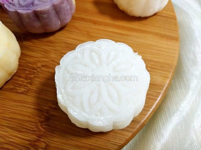 22.倒扣轻轻按压出花型,脱模即可(白色冰皮月饼完成)