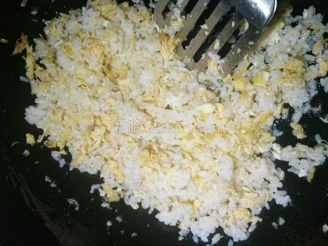 4.米饭最好是剩饭,先捣碎。鸡蛋炒成型马上倒入剩饭翻炒。