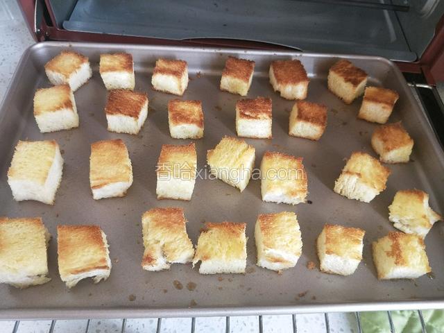 5.掏出的面包部分切3片,每层切9块,一共27块,均匀的刷一层黄油蜂蜜