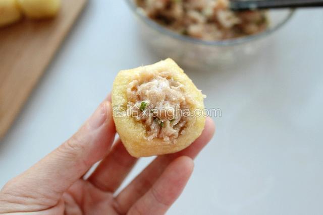 5.把豆泡上面挖个小口,用筷子将肉馅酿进去